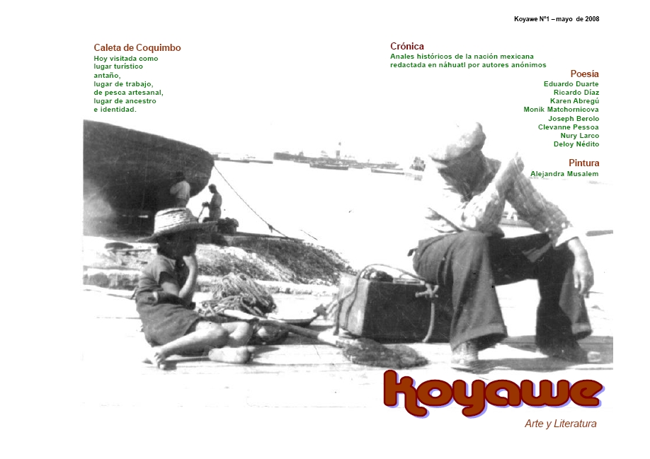 | Editorial En Las Compañías, ciudad de La Serena, Chile, a 20 días del mes de mayo de 2008, doy por fundada la revista de arte y literatura "Koyawe". Me acompañan en este momento, mis lentes, el pesado ruido del computador, un par de chalones para el frío de mis piernas y un gran entusiasmo para sacar adelante este proyecto de edición electrónica y en papel. Espero su paciencia y colaboración, espero sus creaciones, ideas, críticas y su amistad. ![]() ![]() ![]() Eduardo Duarte GENIOLOGÍA